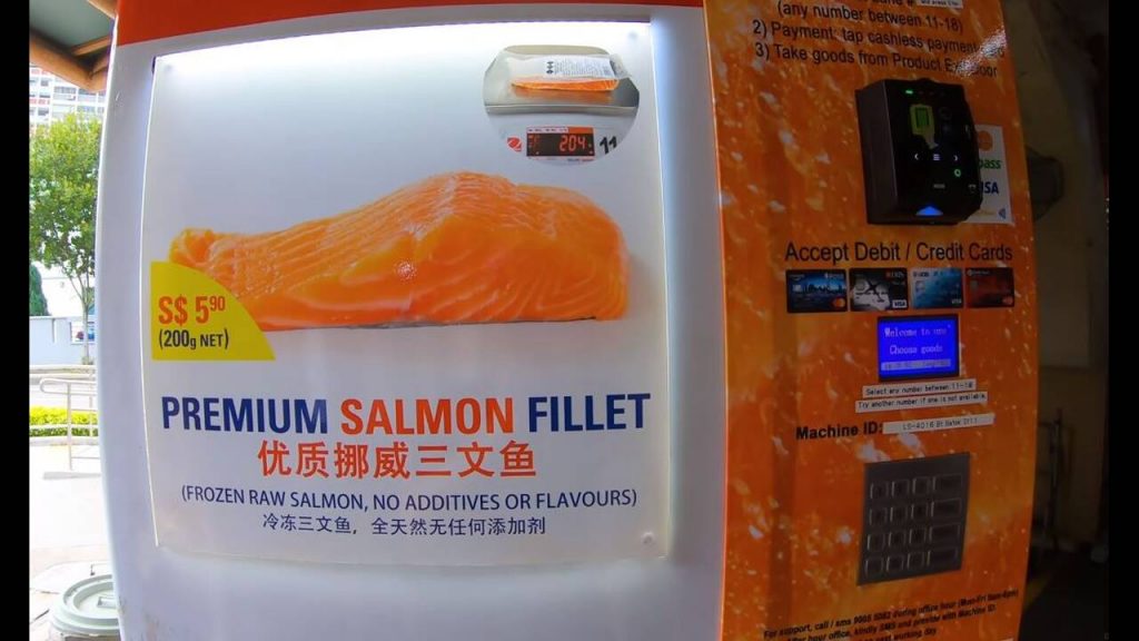Τον περασμένο Ιανουάριο, στο εμπορικό κέντρο Wisteria στη Σιγκαπούρη εμφανίστηκε ένα καινούριου τύπου ATM: στο οποίο μπορείτε να κάνετε ανάληψη όχι χρημάτων, αλλά… φιλέτων κατεψυγμένου σολομού από τα νορβηγικά φιορδ, βάρους 200 γραμμαρίων το καθένα.