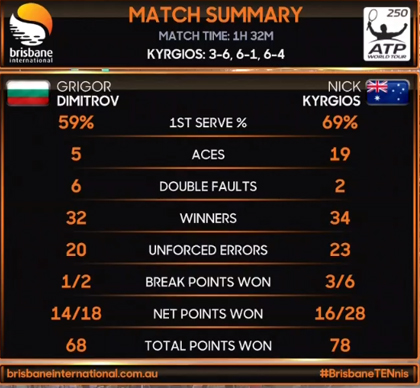 Στον τελικό του Brisbane International, όπου θα αντιμετωπίσει τον Ράιαν Χάρισον, βρίσκεται ο Νικ Κύργιος μετά τη μεγάλη νίκη με ανατροπή επί του υπερασπιστή του τίτλου και Νο3 της παγκόσμιας κατάταξης, Γκριγκόρ Ντιμιτρόφ μετά από ένα διασκεδαστικό ματς!