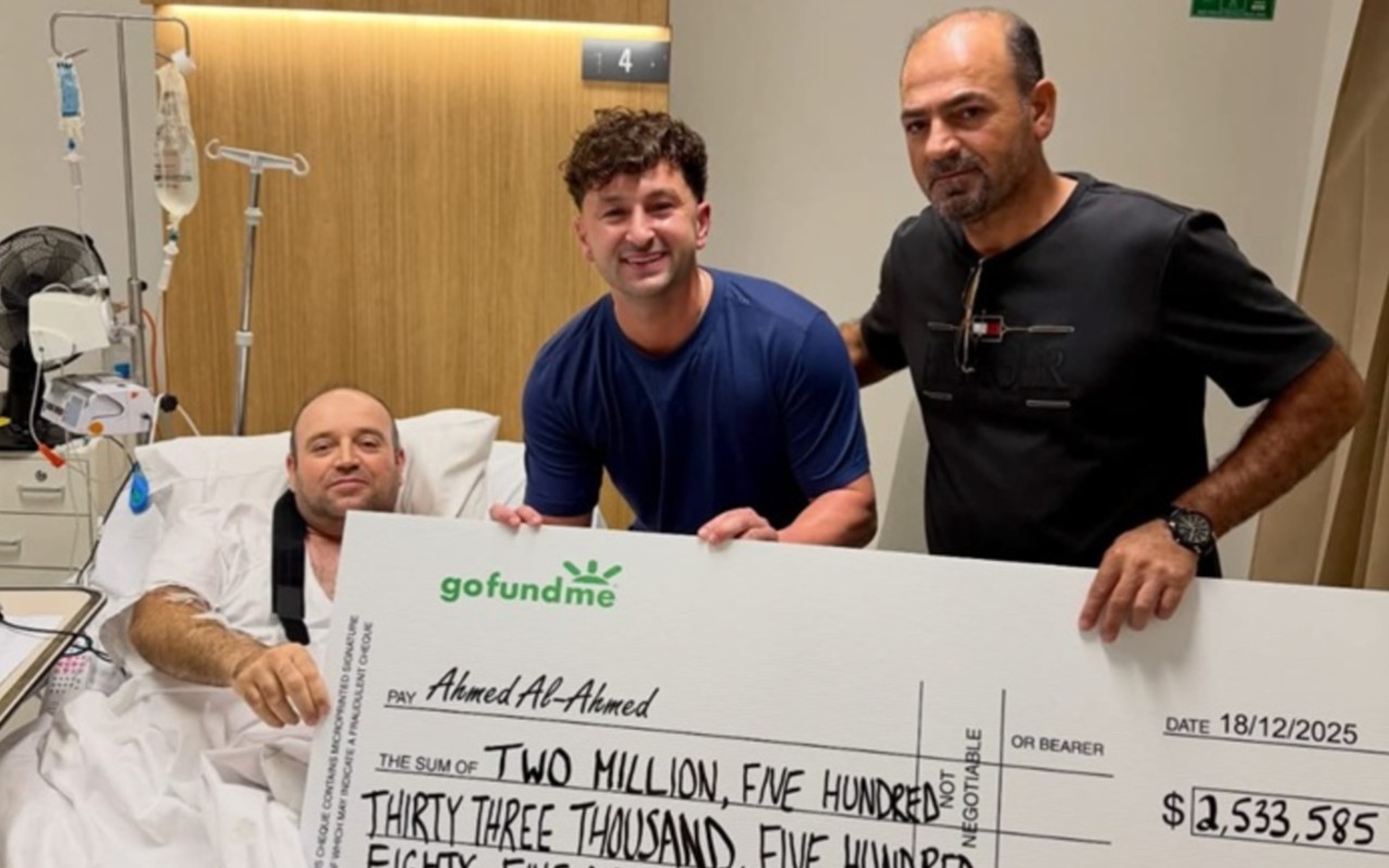 Ένα ποσό ύψους 2,5 εκατ. δολαρίων παραδόθηκε στο νοσοκομείο στον Άχμεντ Αλ-Άχμεντ, τον άνδρα που αφοπλίζοντας έναν από τους δράστες της τρομοκρατικής επίθεσης στο Bondi Beach στο Σίδνεϊ χαρακτηρίστηκε ήρωας από την αυστραλιανή κοινωνία. Το ποσό συγκεντρώθηκε από περίπου 43.000 ανθρώπους σε όλο τον κόσμο, μέσω διαδικτυακής καμπάνιας, ως ένδειξη αναγνώρισης για την πράξη του.