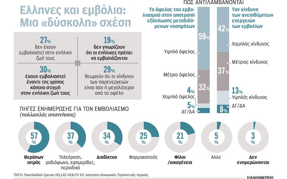 Το 29% των ερωτωμένων θεωρεί ότι οι κίνδυνοι παρενεργειών των εμβολίων είναι είτε ίδιοι είτε μεγαλύτεροι από τα οφέλη του εμβολιασμού, ποσοστό ιδιαίτερα υψηλό με δεδομένες τις πολλές απώλειες σε ζωές που καταγράφονται κάθε χρόνο στη χώρα μας από επιπλοκές της εποχικής γρίπης, οι οποίες θα μπορούσαν να προληφθούν με τα εμβόλια. Μόλις έξι στους δέκα πιστεύουν ότι τα οφέλη υπερνικούν τους κινδύνους και ένα ποσοστό 11% απέφυγε να απαντήσει. Οταν οι συμμετέχοντες κλήθηκαν να «βαθμολογήσουν» τον κίνδυνο από τις ανεπιθύμητες ενέργειες, το 50% τον χαρακτήρισε από μέτριο έως υψηλό. Πηγές ενημέρωσης για τον εμβολιασμό αναφέρονται –με δυνατότητα πολλαπλών απαντήσεων– από το 57% ο θεράπων ιατρός, από το 37% η τηλεόραση, το ραδιόφωνο, οι εφημερίδες και τα περιοδικά, ενώ στην τρίτη θέση βρίσκεται το Διαδίκτυο (34%). Ενας στους τέσσερις δεν γνωρίζει εάν ανήκει σε ομάδα υψηλού κινδύνου για πνευμονικές λοιμώξεις για τις οποίες συστήνεται εμβολιασμός έναντι του πνευμονιόκοκκου και οκτώ στους δέκα δεν γνωρίζουν ότι υπάρχουν εμβόλια κατά του έρπητα ζωστήρα και κατά του ιού των ανθρώπινων κονδυλωμάτων.