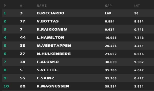 Στον 41ο γύρο ο Ρικιάρντο έκανε μια απίθανη προσπέραση στον παγκόσμιο πρωταθλητή και πέρασε τρίτος πιέζοντας τον Φέτελ για τη δεύτερη θέση, ενώ ένα γύρο μετά άφησε πίσω του και τον Φέτελ. Στον 45ο γύρο, δε, αιφνιδίασε τον Μπότας ανεβαίνοντας στην πρωτοπορία της κούρσας. Έναν γύρο νωρίτερα ο Φερστάπεν βιάστηκε να προσπεράσει τον Φέτελ και με δική του ευθύνη (τιμωρήθηκε με ποινή δέκα δευτερολέπτων) υπήρξε επαφή και σπινάρισμα των δύο μονοθεσίων, με τον Γερμανό να υποχωρεί έβδομος. Ο Ραϊκόνεν ευνοήθηκε από τις «καραμπόλες» και έφτασε τρίτος και να απειλεί τον Μπότας για τη δεύτερη θέση, δίχως όμως να τον προσπεράσει. Το φινάλε του αγώνα είδε τον Αλόνσο να αφήνει όγδοο τον Φέτελ που είχε εμφανές πρόβλημα ρυθμού.