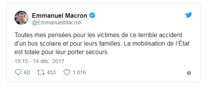 O γάλλος πρόεδρος εγραψε στο τουίτερ «Όλες οι σκέψεις μου στα θύματα αυτής της τρομερής συγκρουσης του σχολικού λεωφορείου και στις οικογένειές τους. Η κινητοποίηση του κράτους είναι συνολική για να τους βοηθήσει».