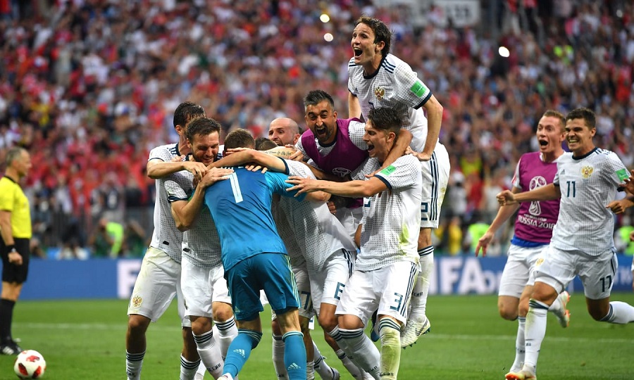 Η οικοδέσποινα, Ρωσία, άφησε στον τόπο την Ισπανία, επικρατώντας 4-3 στα πέναλτι (1-1 κανονική διάρκεια και παράταση) και προκρίθηκε στους «8» του Παγκοσμίου Κυπέλλου. Ήρωας για τους νικητές ο Ιγκόρ Ακινφέεφ, ο οποίος απέκρουσε την εκτέλεση του Κόκε, που ήταν η τρίτη για τη «φούρια ρόχα», αλλά και του Άσπας, που ήταν η πέμπτη.