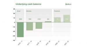 «Γραφική παράσταση» για την κατάσταση της αυστραλιανής οικονομίας που από το έλλειμμα των $14,2 δις που εκτιμάται ότι θα εμφανίσει το επόμενο οικονομικό έτος, θα ανακάμψει εμφανίζοντας πλεόνασμα $2,2 δις κατά το επόμενο. Φώτο: ΑΑP