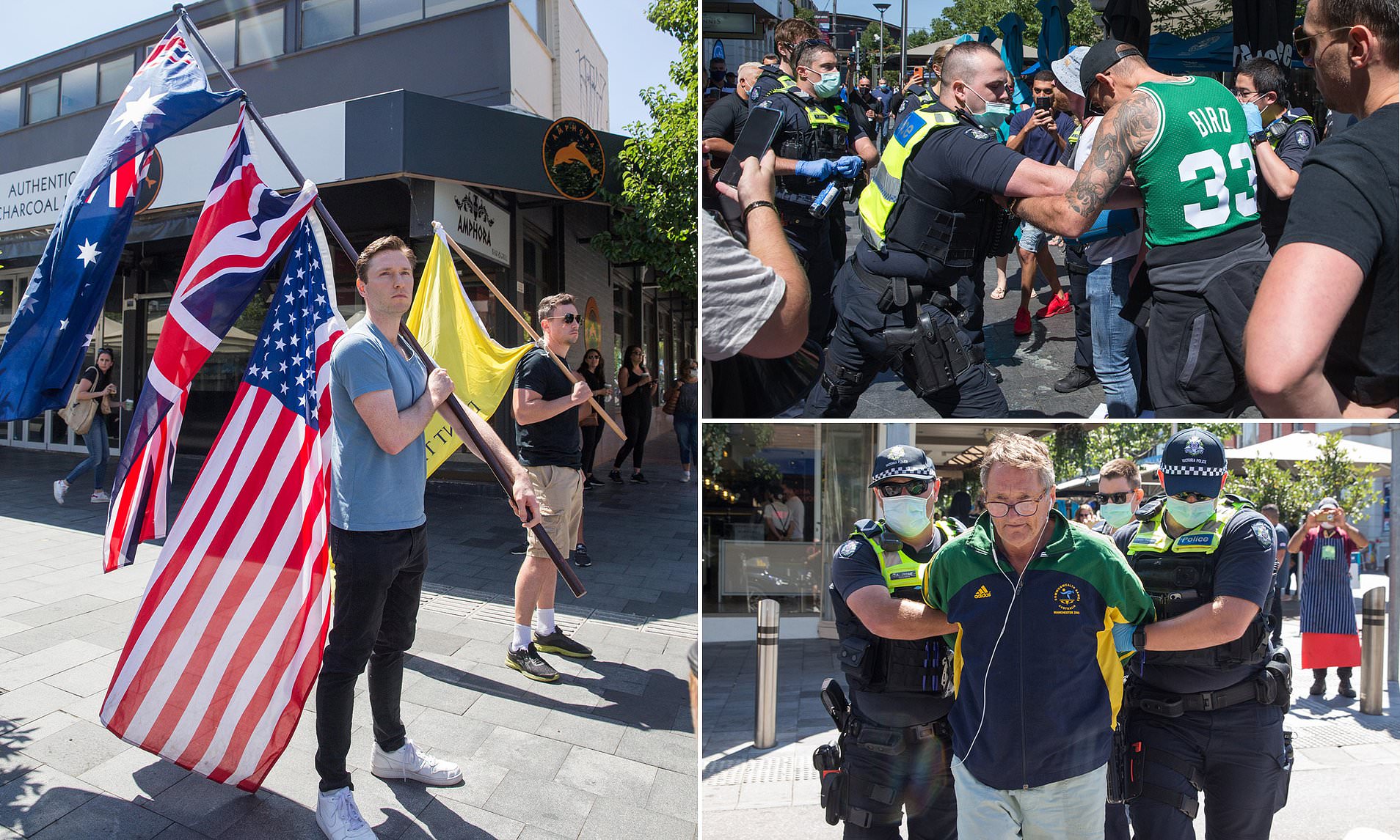 Δεκάδες αστυνομικοί έσπευσαν στο σημείο γύρω στις 12 το μεσημέρι και, σύμφωνα με την Αστυνομία, συνέλαβαν τρεις άνδρες για διατάραξη της δημόσιας τάξης και για παράβαση της Οδηγίας του Αρχιάτρου της Βικτώριας για τον περιορισμό της πανδημίας.
