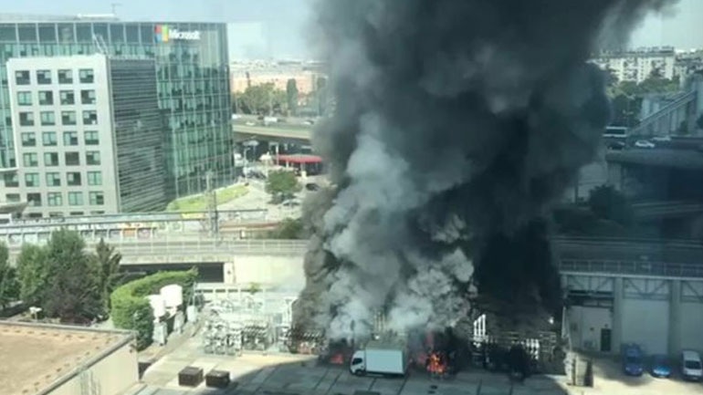 Ενας διανομέας του RTE ανεφλέγη στις 11.30 το πρωί μπροστά στο ξενοδοχείο Accor Ισί-λε-Μουλινό, ακριβώς δίπλα στην έδρα της Microsoft στην όχθη του Σηκουάνα, προκαλώντας σύννεφα μαύρου καπνού. Περί τα 2.500 άτομα απομακρύνθηκαν από τα παρακείμενα κτίρια, σύμφωνα με τις αρχές.