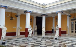 Η μαγική περιπλάνηση στο λαμπρό παρελθόν ξεκινά από την είσοδο του Ανακτόρου, όπου θα αντικρίσετε εκπληκτικά γλυπτά και αγάλματα εμπνευσμένα αρχαία ελληνική μυθολογία, εντυπωσιακούς κλιμακωτούς κήπους και θα έχετε μια εξαίσια πανοραμική θέα. Καθώς εισέρχεστε στο ανάκτορο, πρέπει οπωσδήποτε να σταθείτε και να παρατηρήσετε το κλιμακοστάσιο, ένα ανεκτίμητο έργο τέχνης το οποίο υμνεί την ελληνική μυθολογία με αγάλματα του Δία και της Ήρας, μικρότερα αγαλματίδια και γύψινα γλυπτά. Δεξιά θα δείτε το πορτρέτο της Αυτοκράτειρας Ελισάβετ, ενώ αριστερά θα θαυμάσετε το μαρμάρινο τζάκι και τα αγαλματίδια που το κοσμούν.
