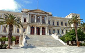 Το στολίδι της πλατείας Μιαούλη, στο ιστορικό κέντρο της Ερμούπολης στη Σύρο, στέκει υπερήφανο στο πέρασμα των χρόνων. Δεν υπάρχει ανθρώπινο βλέμμα που να μην καρφώθηκε πάνω του και φωτογραφικός φακός που να μην το απαθανάτισε. Το επιβλητικό τριώροφο Δημαρχείο, έργο του Ερνέστου Τσίλερ, αποτελεί δίχως αμφιβολία ένα από τα σπουδαιότερα αξιοθέατα της Σύρου. Πρόκειται για ένα από τα μεγαλύτερα δημαρχιακά μέγαρα της χώρας, το οποίο θεμελιώθηκε το 1876, ενώ τα εγκαίνιά του πραγματοποιήθηκαν το 1898. Χτισμένο στον άξονα της Ελευθερίου Βενιζέλου (οι ντόπιοι την αποκαλούν και Ερμού), σήμερα στεγάζει τα γραφεία του Δήμου Ερμούπολης, δικαστήρια και άλλες υπηρεσίες του Δημοσίου. Η θεμελίωση και ολοκλήρωση αυτού του έργου τέχνης οφείλεται στην επιμονή και το ζήλο του δημάρχου Δ. Βαφιαδάκη, ο οποίος απεβίωσε το 1898, το άγαλμα του οποίου κοσμεί την είσοδό του. Εδώ θα σας εντυπωσιάσουν η Αίθουσα Συνεδριάσεων, με τα κειμήλια και τους πίνακες που μαρτυρούν την αίγλη του παρελθόντος, η άμαξα περιπάτου της πριγκίπισσας Σίσι στην πίσω έξοδο, η μνημειώδης σκάλα που οδηγεί στον πρώτο όροφο και η εντυπωσιακή αρχιτεκτονική του.
