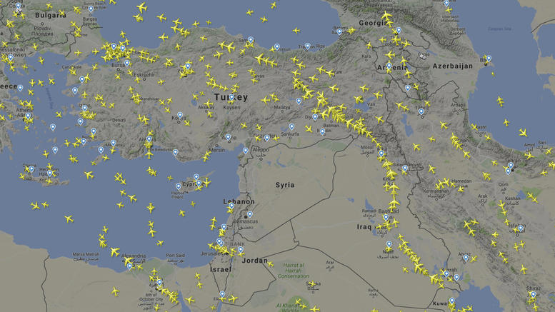 Σύμφωνα με το flightradar24 από όπου είναι η εικόνα, κανένα αεροσκάφος δεν βρίσκεται στον εναέριο χώρο της Συρίας. Ολες οι αεροπορικές εταιρείες έχουν τροποποιήσει τα δρομολόγιά τους και ακολουθούν άλλες διαδρομές.