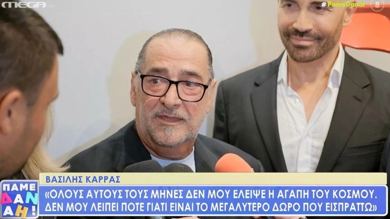 Ο Βασίλης Καρράς, λίγους μήνες μετά την περιπέτεια της υγείας του, μίλησε για την νέα του συναυλία, αλλά και για την στήριξη του κόσμου όλον αυτόν τον καιρό. «Καιρός δεν ήταν να με δείτε; Δεν φαίνεται ότι είμαι καλά ρε παιδιά; Είμαι πολύ καλά», είπε στους δημοσιογράφους.