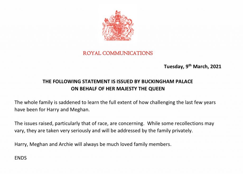Η βασίλισσα Ελισάβετ και η οικογένειά της εξέδωσαν ανακοίνωση σήμερα Τρίτη, σε απάντηση των κατηγοριών από τη Μέγκαν Μαρκλ και τον πρίγκιπα Χάρι σύμφωνα με τις οποίες ένα μέλος της βασιλικής οικογένειας έκανε ένα ρατσιστικό σχόλιο για τον γιο τους, ενώ οι αυλικοί αγνόησαν τις εκκλήσεις της Μέγκαν για βοήθεια όταν αισθανόταν ότι ήθελε να αυτοκτονήσει.