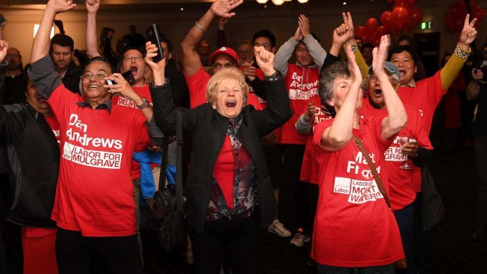 Labor supporters celebrated early on as the numbers pointed to a big swing to Daniel Andrew’s party.